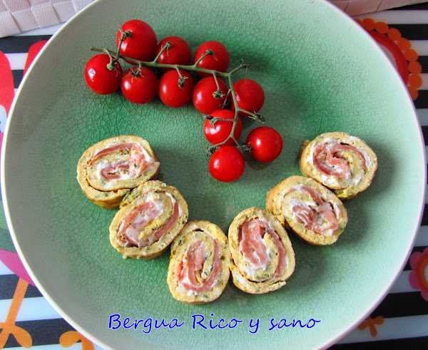 Estos rollitos se preparan en un satiamén y nos sirven de entrante o de cena ligera con una buena ensalada, por ejemplo. Lo podemos rellenar con lo que se nos ocurra y la tortilla podemos especiarla como nos apetezca o hacer una simple tortilla francesa; yo hoy le he dado un toque asiático; si alguno de los ingredientes no os convence, cambiadlo por lo que más os apetezca =) Para 1 rulo, que da unos 10 rollitos: