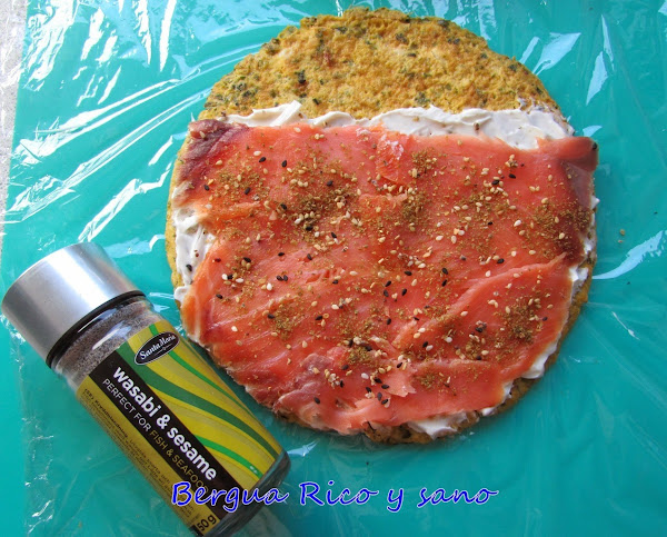 4. Repartimos el puerro en tiritas finas por el centro y el salmón sobre el queso crema. Espolvoreamos con la mezcla de wasabi en polvo y las semillas de sésamo. Que conste que a mí no me gusta la pasta de wasabi, pero esta mezcla en polvo es muy discreta.