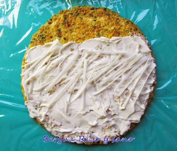 3. Dejamos que se enfríe un poco la tortilla, la colocamos sobre un cuadrado de papel transparente de cocina. Entonces la untamos con el queso crema casi entera. Dejamos una solapa sin untar (unos 3 dedos acostados), parecido a cuando hacemos sushi. Esa última orilla no la rellenamos para que al enrollar no se nos salgan los ingredientes.