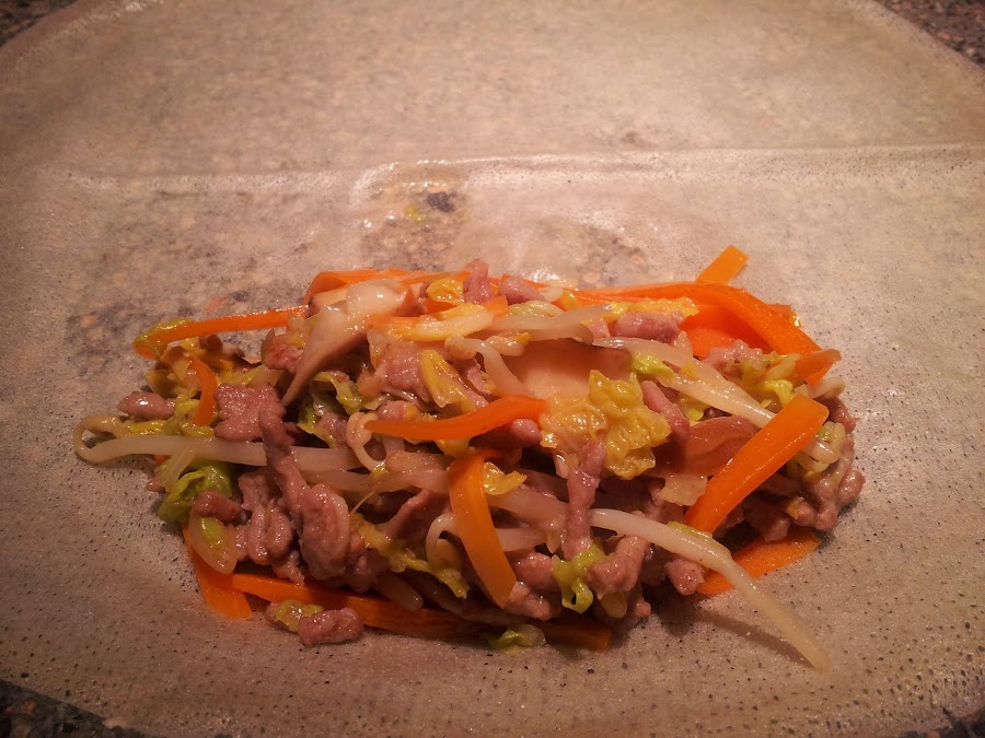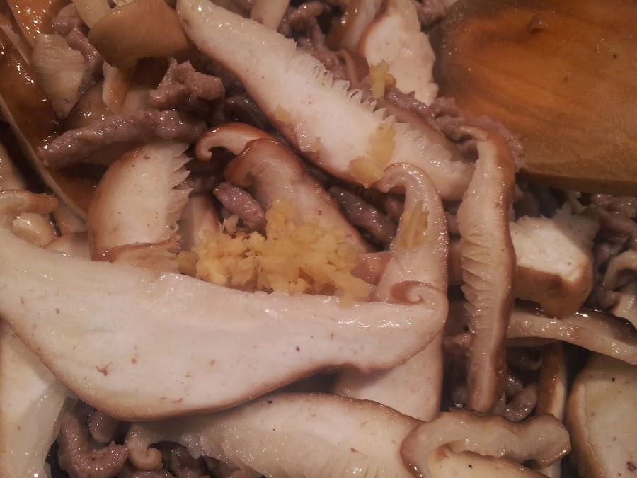Lavamos bien el resto de ingredientes y los vamos incorporando por este orden: las setas shitake cortadas en juliana. Rehogamos. Un poco de jengibre fresco, que le dará una chispa de sabor. La col china (valdría también repollo) y las zanahorias cortadas en tiras finas. Los vamos rehogando unos minutos dando vueltas continuamente a fuego medio-alto. Luego añadimos los brotes de soja y lo mismo, removemos bien todo el conjunto para que se vaya haciendo. NOTA: Debe quedar un pelín crudo (o semi crudo) pues luego lo freiremos. Es decir, que llevan dos cocciones.