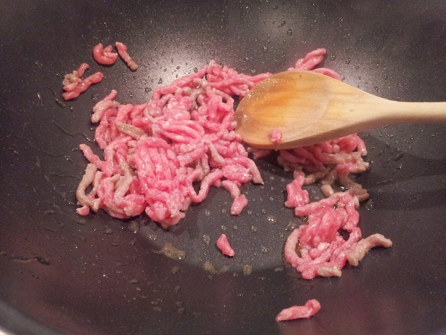Primero vamos a ir con el relleno. En el wok echamos unas dos cucharadas de aceite de oliva y las calentamos. Añadimos la carne (sin sal) y vamos friéndola hasta que pierda el color rosado.