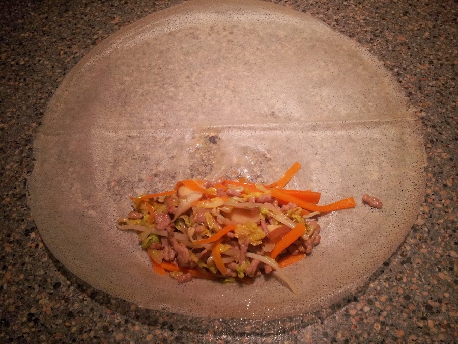 Llega el momento de construir el rollito. Podéis comprar pasta china especial para rollitos, yo en esta ocasión cogí pasta filo, que viene en láminas redondas. El proceso es exactamente el mismo. Batimos un huevo y reservamos, lo usaremos para sellar la pasta.