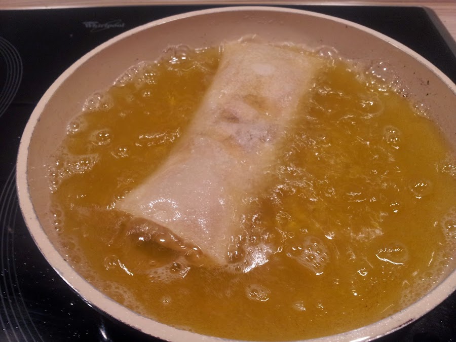 En una sartén o freidora con bastante aceite de oliva, vamos friendo los rollitos. Importante: Debemos ponerlos primero con el cierre hacia abajo para que así se selle bien. El aceite debe estar caliente pero no demasiado, ya que se nos quemarían enseguida. Cuando estén doraditos por ambas caras, los vamos sacando a un plato con papel absorbente. Terminamos con toda la tanda.