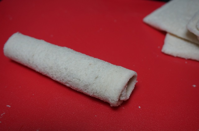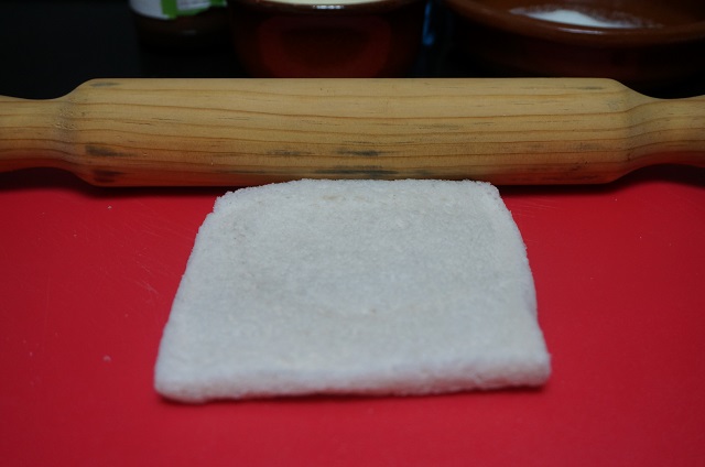 Preparamos las rebanadas de pan de molde, las aplastamos un poco con un rodillo, que queden más finas.