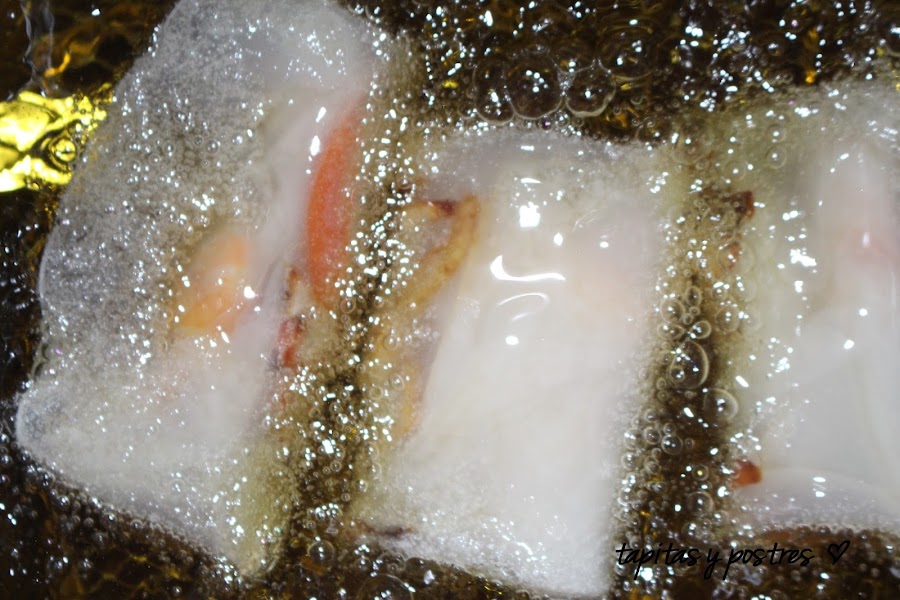 Cerramos los rollitos enrollando primero de la mitad hacia dentro, luego los laterales y terminamos enrollando, Freimos en abundante aceite caliente hasta que los veamos ligeramente dorados ( aunque estas obleas no se doran mucho).