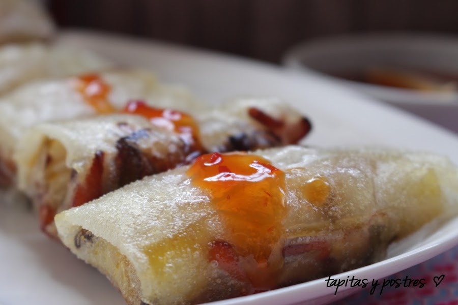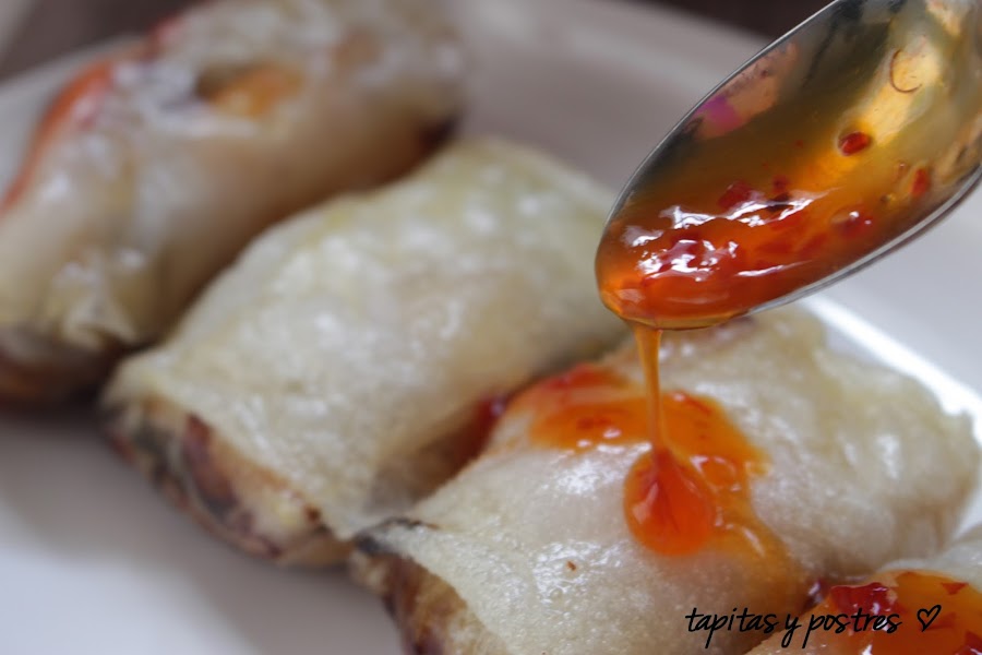 Desde que la tuve en mis manos, pensaba en qué usarla. Es una salsa semi picante, tenía que prepararla con algo oriental. Y más oriental que unos rollitos, no hay nada.Pero en esta ocasión no iba a preparar los clásicos rollitos de primavera, así que indagando en la red sobre la salsa chili, descubrí que se usa mucho en la cocina tailandesa, en unos rollitos de papel de arroz.