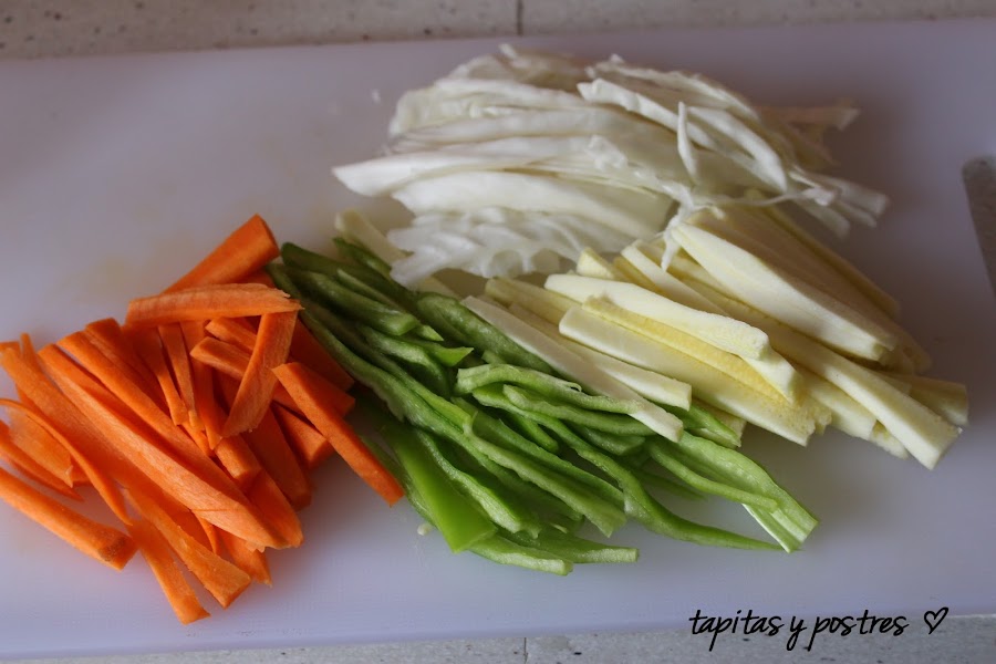 Cortamos las verduras en bastoncitos, podéis poner las verduras que se os antoje, yo puse estas que ya las tenía en casa.Con las cantidades que os doy os saldrán unos 8 rollitos.