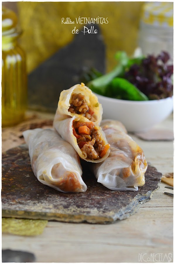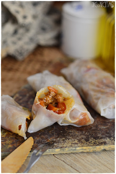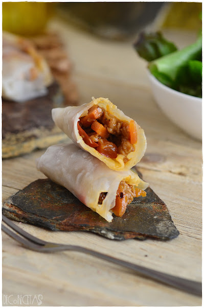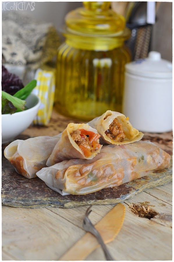El destino quiso que mi primera toma de contacto con las obleas de arroz fuera este.Vamos, el destino y el desastre que se formó cuando intente freírlas, aunque ya os adelanto, que no me di por vencida y al realizarlas una segunda vez, ya me quedaron bien fritas.