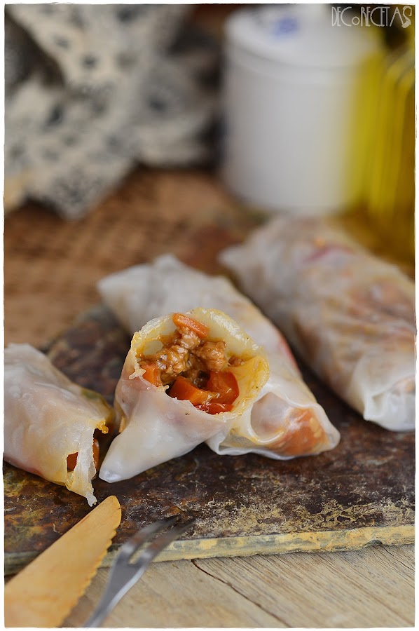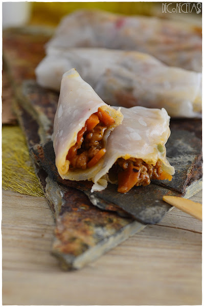 Simplemente lo utilice para rellenar estas obleas especiales de papel de arroz. Hay que hidratarlas metiéndolas en agua templada, lo justo para que cambien de rígidas a blanditas, es decir, meterlas y sacarlas rápidamente. Podemos el relleno en la mitad y cerramos el paquete enrollándolas.