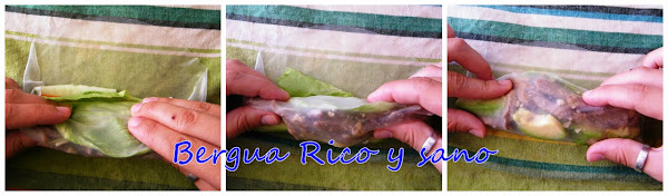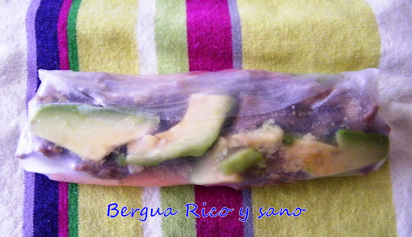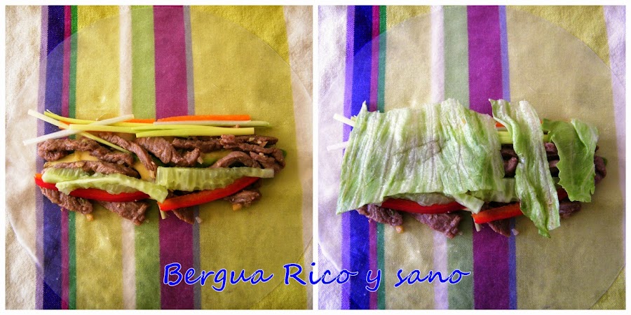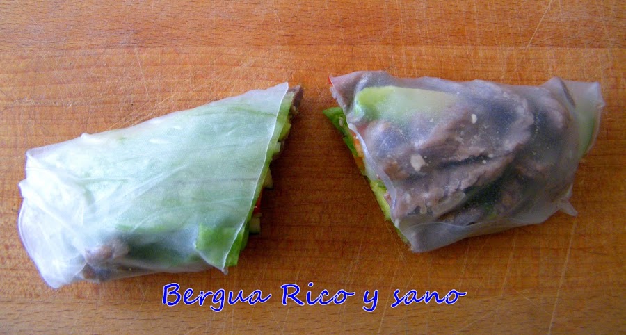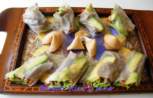 Los rollitos de papel de arroz son a Vietnam lo que los rollitos de primavera son a China; de hecho, estos rollitos se llaman también "rollos de verano" en Vietnam, ya que se sirven crudos o cocidos en lugar de fritos. La realidad es que los rollitos, con variantes en el relleno y la masa, se preparan y consumen por toda Asia, con lo cual hay versiones tailandesas, indonesias, coreanas, japonesas, filipinas... Y a través de estas culturas, también muchos países europeos tienen sus propias versiones. El rollo de verano típico vietnamita lleva vermicelli de arroz, pero yo he preferido dejar más sitio a las verduras. En la foto veis, además de los rollos, unas galletas de la fortuna "chinas", tan chinas como yo, ya que el concepto nació en los Estados Unidos.