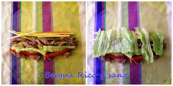 5. Colocamos la óblea sobre un trapo limpio estirado, así se seca también el exceso de agua. Distribuimos en en centro los ingredientes en paralelo a nosotros. Terminaremos con la lechuga.
