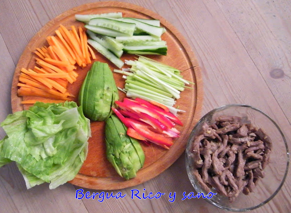 3. Es más sencillo preparar los rollos si tenemos todos los ingredientes preparados: zanahoria, pepino, puerro y pimiento en juliana; aguacate en trozos alargados más gruesos y hojas de lechuga cortadas.