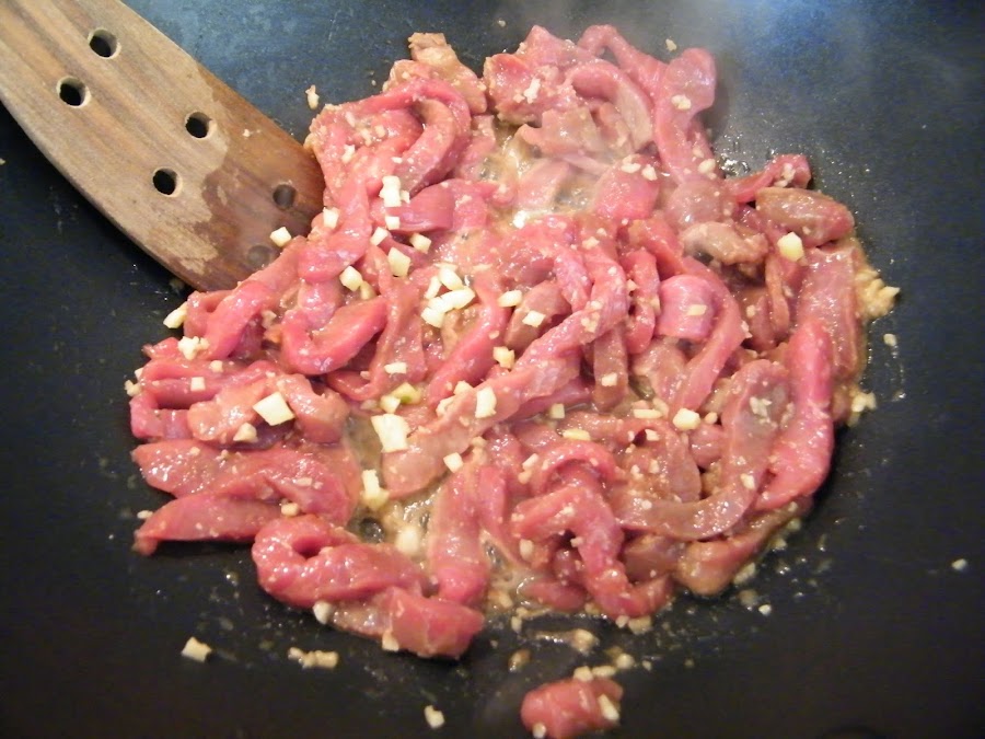 2. Después saltearemos la carne en el marinado en un wok.