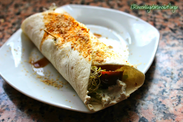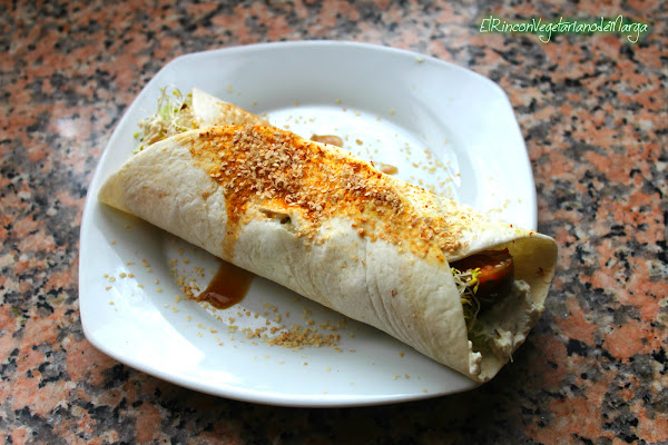 Con el quesito de soja untamos la tortilla (wrap), encima ponemos trocitos de lechuga, tomate cherry y germinados, lo aliñamos con salsa de soja y cebolla en polvo. Lo cerramos y le incorporamos levadura de cerveza por encima.