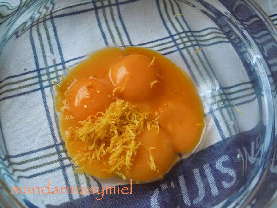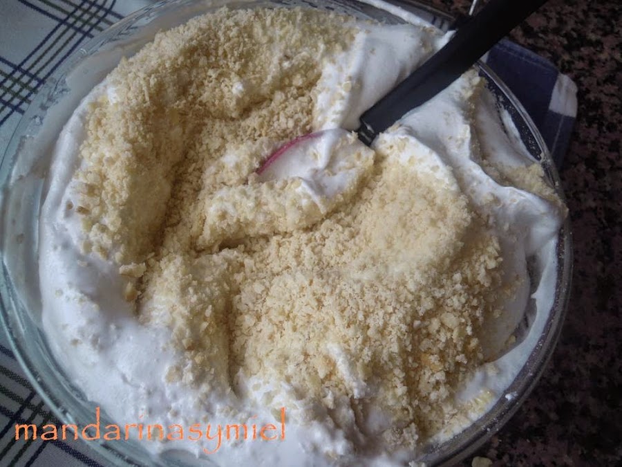 Echa por encima, con una cuchara, la mezcla de calabazate y yemas sin que llegue a tocar los lados, termina de poner el resto de merengue y almendra.