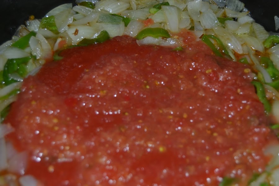 Ponemos en la sartén el aceite con la cebolla, los pimientos y un poco de sal., sofreímos un poco y a continuación le añadimos los tomates rallados, dejamos hacer unos minutos.
