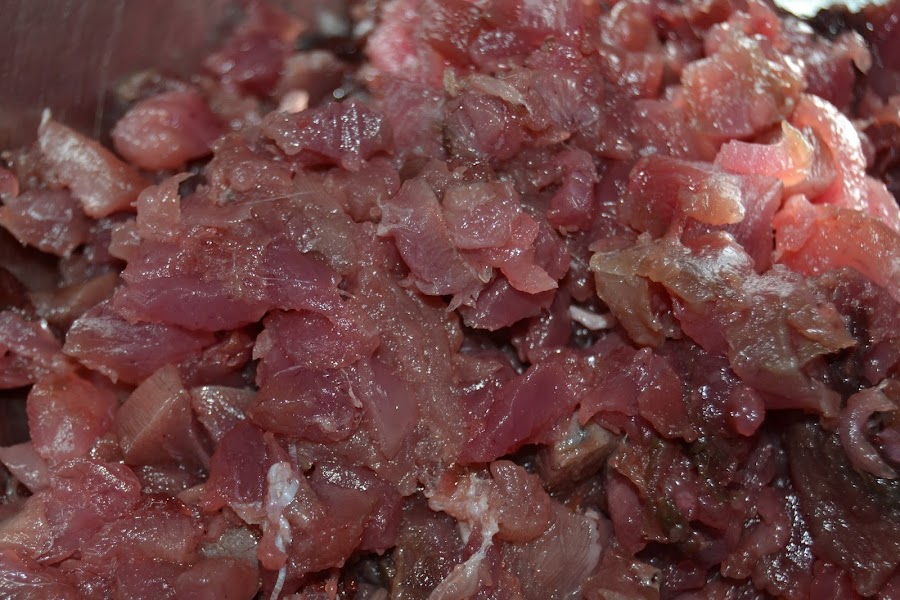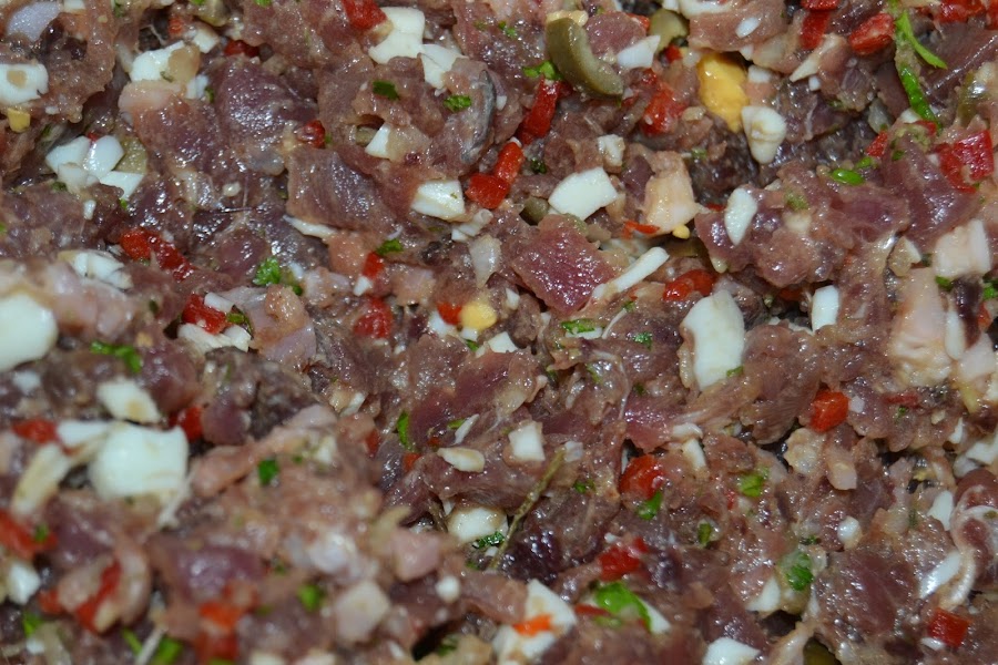 Quitamos piel y espinas al bonito y lo cortamos a trozos pequeñitos, si preferís picarlo lo podéis hacer, yo lo corte a cuchillo.