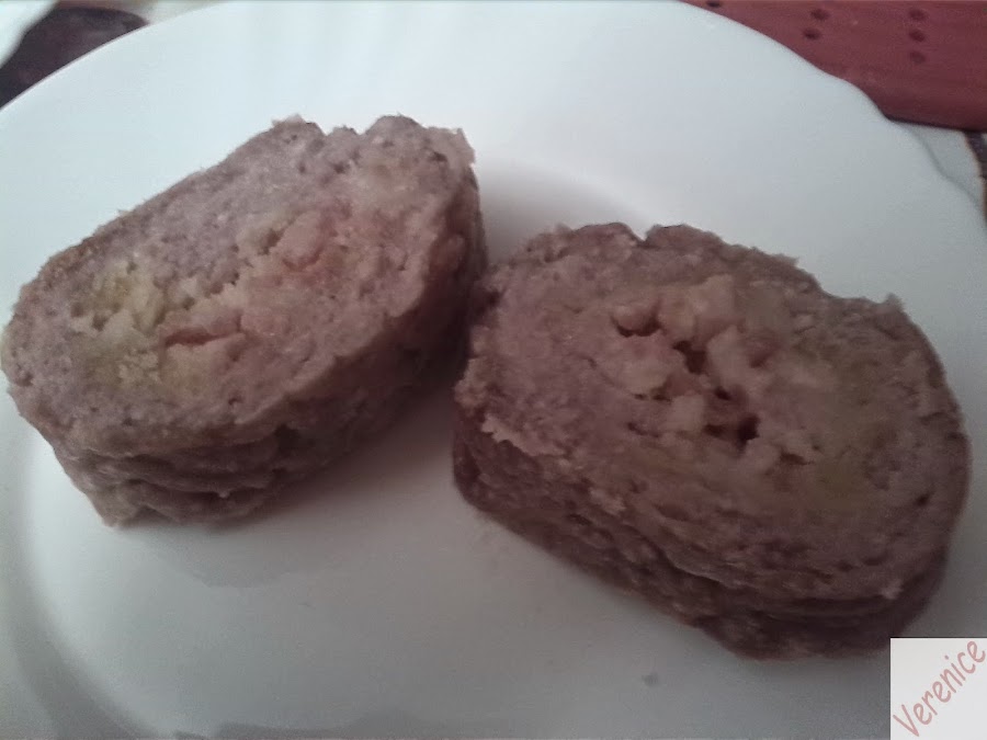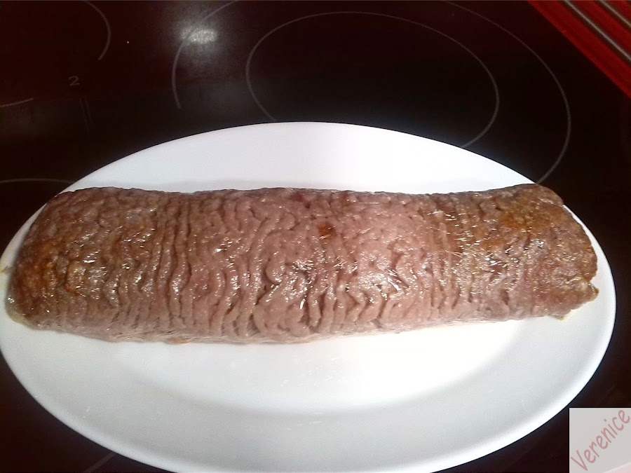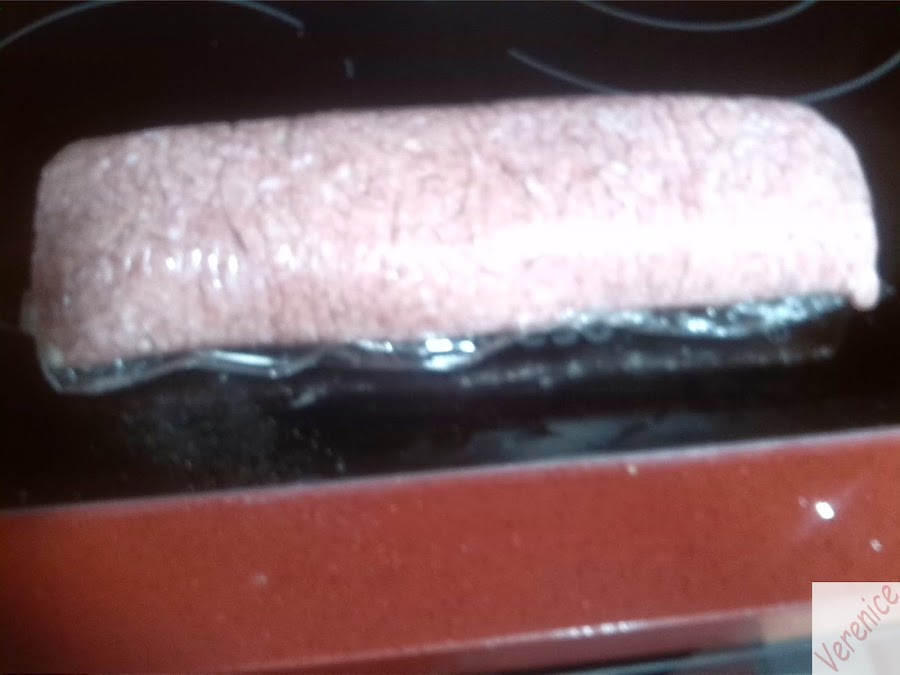 Enrollamos sobre sí misma la carne con la ayuda del papel film, retirándolo al mismo tiempo