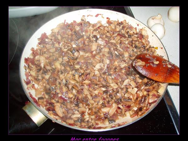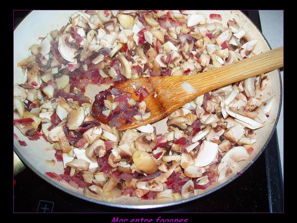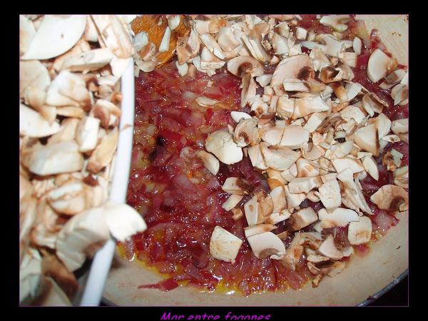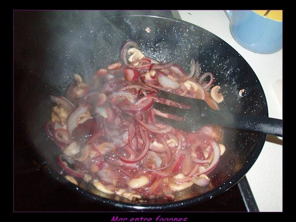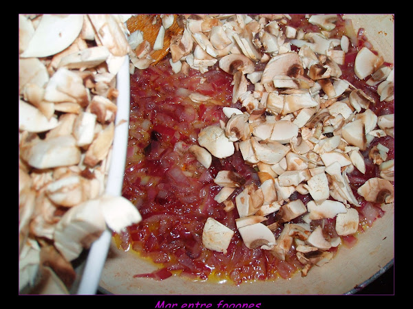 En el aceite de la carne ponemos la cebolla troceada y los champiñones también troceados.