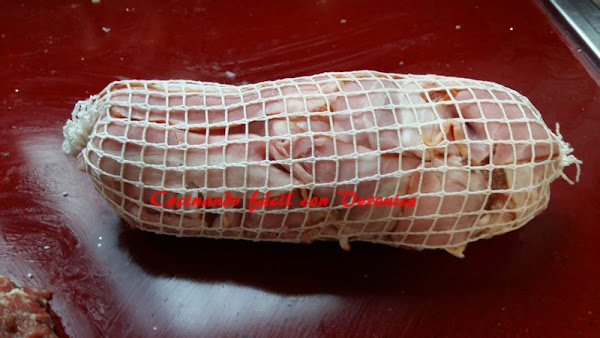 Lo más complicado: introducir el rollo de carne envuelto en bacon en la malla de carne.