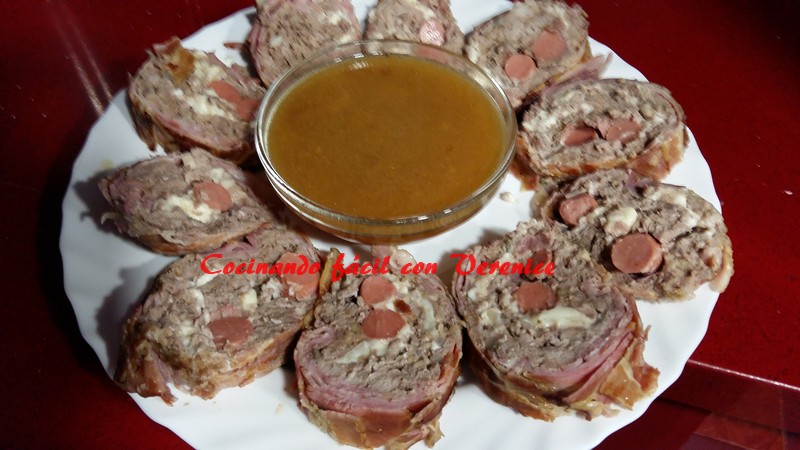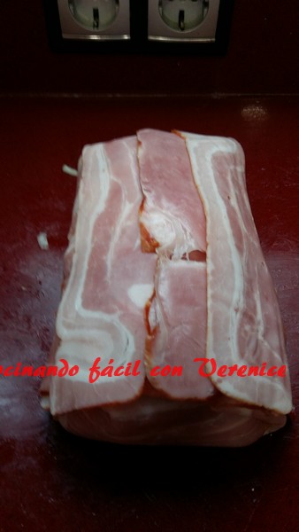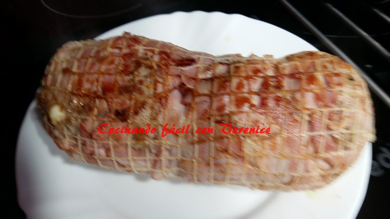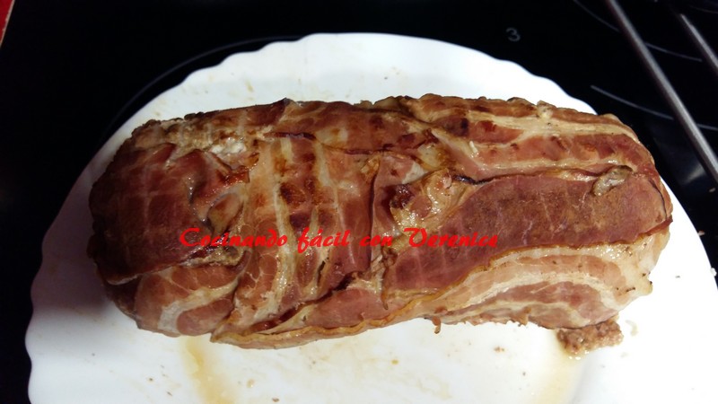Ya formado el rollo de carne y bien apretadito lo cubrí con las lochas de bacon, usé sólo 8, así que dejé el resto para el otro rollo.