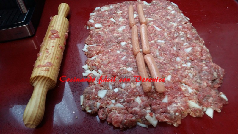Ponemos sobre la encimera el contenido del bol, aplastando con un rodillo la carne de forma homogénea e intentando igualarla por todos los lados.