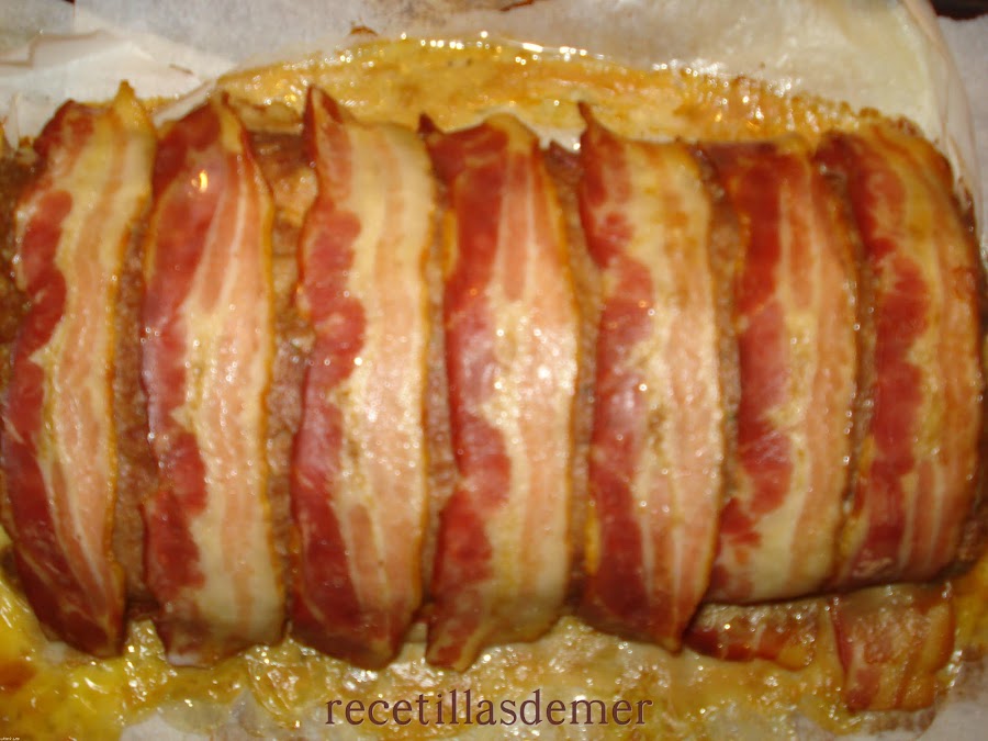 Ahora es cuando lo enrollamos desde el lado estrecho y empujándonos con el papel con el que iremos controlando que el rollo no quede suelto. Cuando este formado lo forramos con tiras de bacon por los dos lados. Sellar los extremos moldeando la carne picada para evitar que se salga el queso.