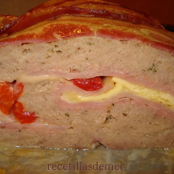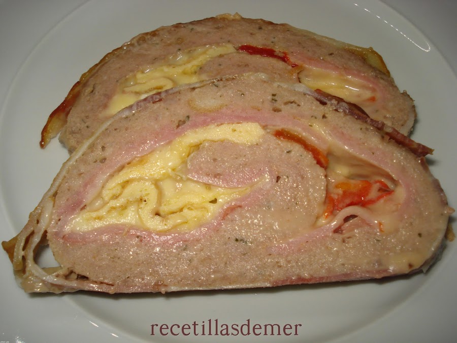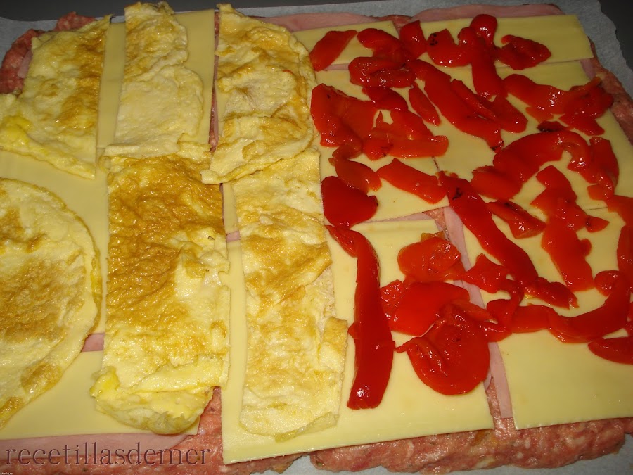 Sobre una lámina de papel sulforizado (papel para hornear) extendemos toda la carne. El cuadrado de carne tendrá unas dimensiones aproximadas de 28 x 35 cm y un grosor de un dedo o así. Sobre la carne distribuimos las lonchas de queso y de jamón, y sobre ellos las tortillas cortadas en tiras y los pimientos de piquillo.