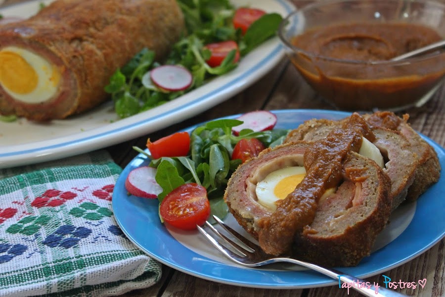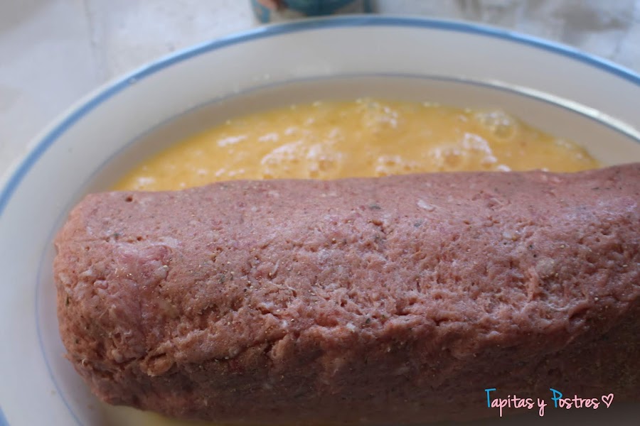 Salpimentamos por fuera. Ahora con cuidado vamos a colocar el rollo en una bandeja y lo bañamos con huevo batido ayudándonos con una cuchara para que coja huevo batido por todos lados. Os recomiendo que no hagais el rollo muy grande, cuesta manipularlo. Es preferible hacer dos mas pequeños con las mismas cantidades (poniendo solo dos huevos cocidos en cada uno).