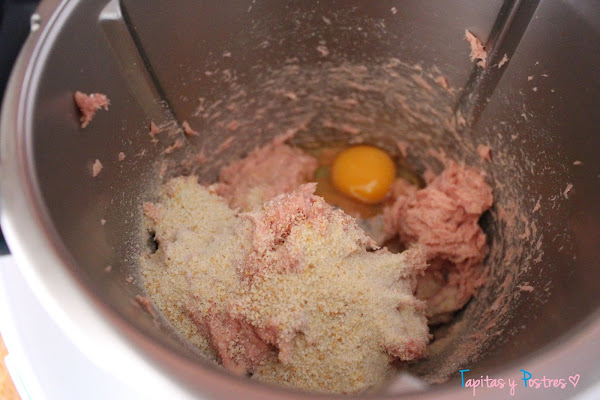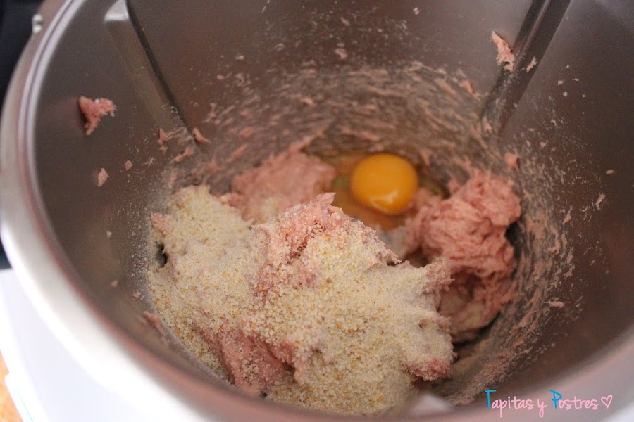 Ponemos la carne en el vaso de la thermomix con las especias. Trituramos unos 10 segundos a velocidad 5. Añadimos el huevo y el pan rallado y volvemos a triturar unos diez segundos más a velocidad 5.