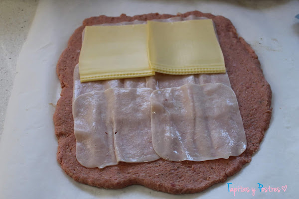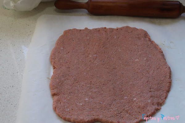 Sacamos la masa de carne y la ponemos sobre papel vegetal. Con las manos húmedas estiramos (podemos hacerlo también con un rodillo) hasta dar forma cuadrada y de un grosor igual por todos lados.