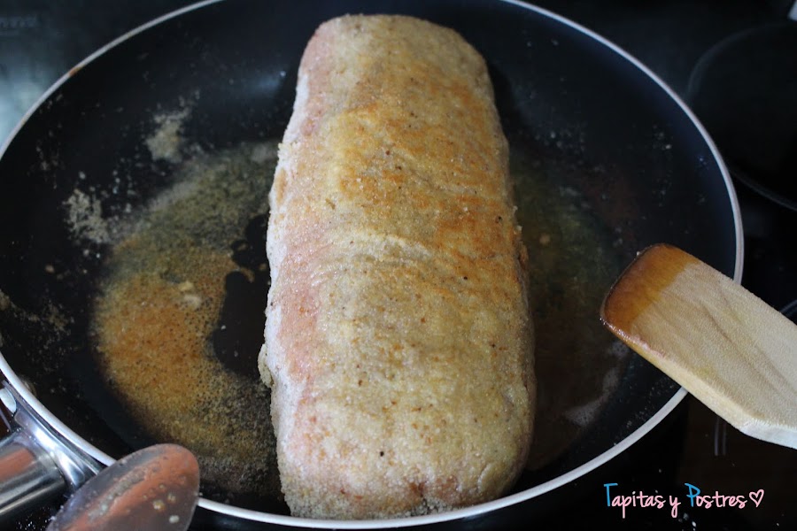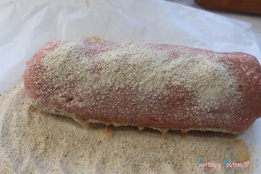 Una vez bañado en huevo batido lo sacamos y ponemos sobre un papel vegetal que tenga pan rallado, y hacemos lo mismo. Vamos echando pan rallado por todos lados.