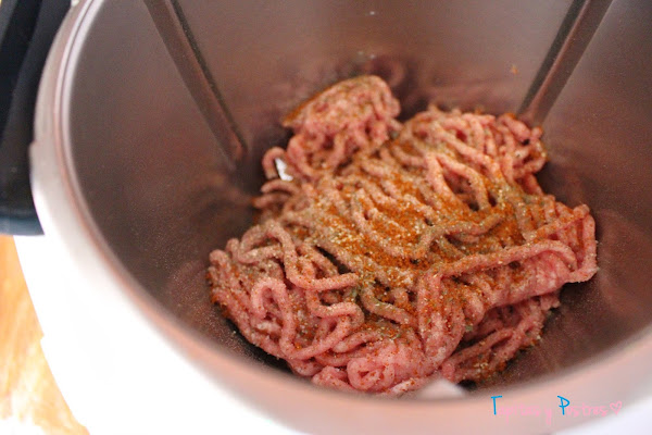 Ponemos la carne y las especias y trituramos para tener la carne bien preparada.