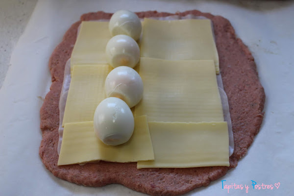 Colocamos encima unas lonchas de pechuga de pavo, queso y cuatro huevos cocidos en medio.