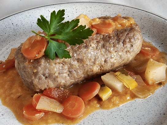 Finalmente, cortamos en rodajas el polpettone y servimos acompañado con la salsa y del resto de las verduras.