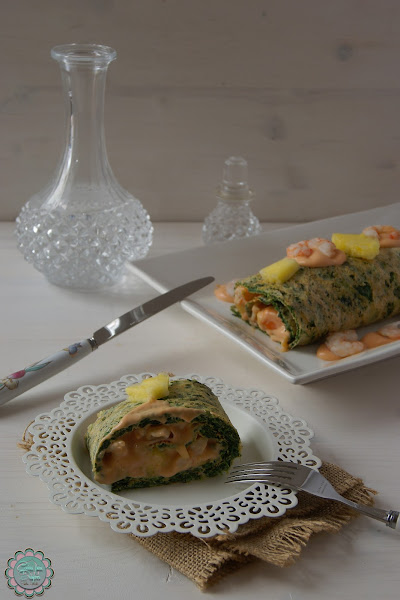 7) Cocemos las gambas con un poco de sal y las pelamos. Troceamos junto con la piña y mezclamos con la salsa rosa. (Reservamos alguna gamba para montar el rollo).