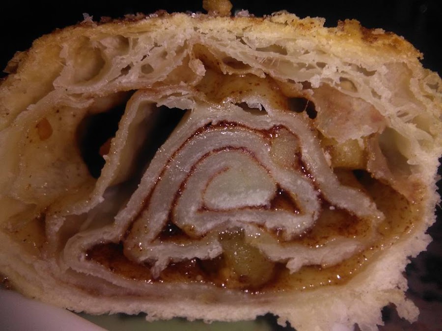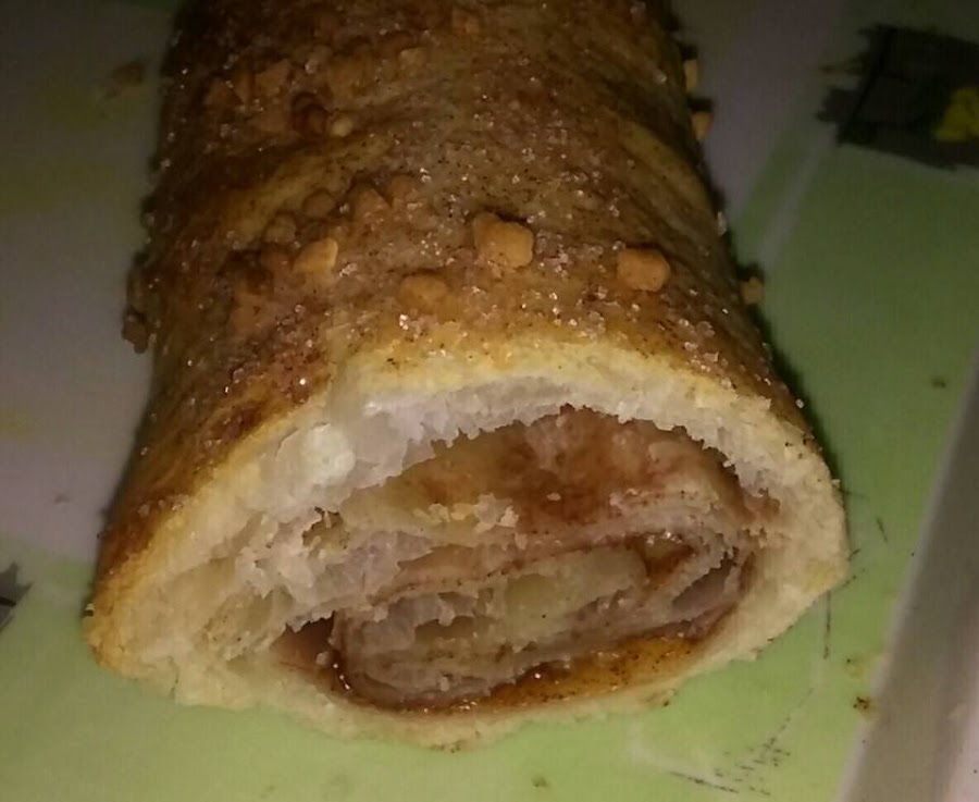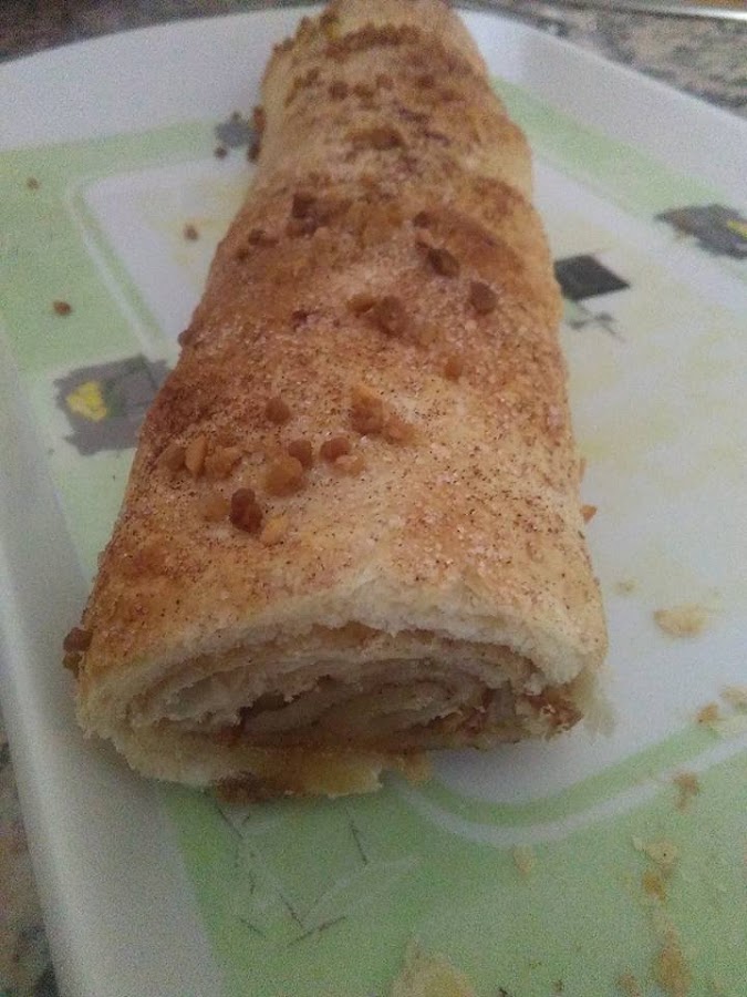 Enrollar y espolvorear otra vez con el azúcar y la canela y un poco de crocanti.