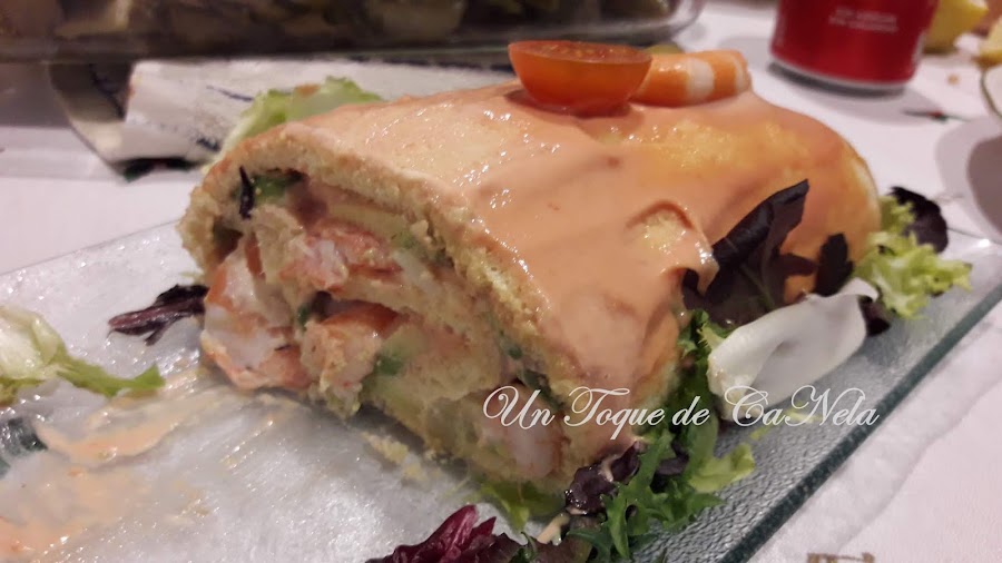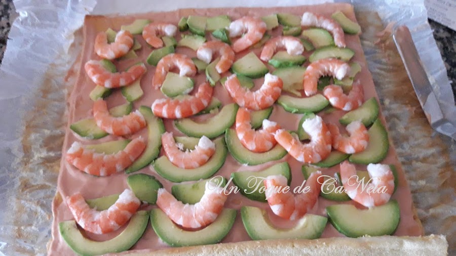 Desenrollar el bizcocho, extender una capa de salsa cocktel.
