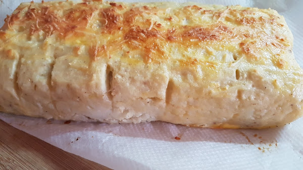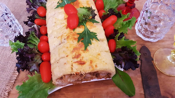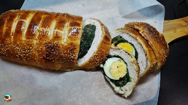 rollo de hojaldre relleno de carne de pollo, espinacas y huevo