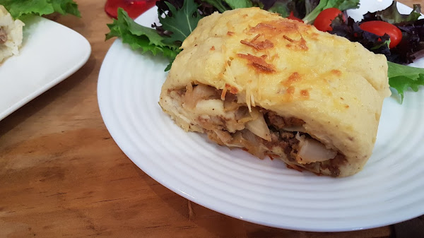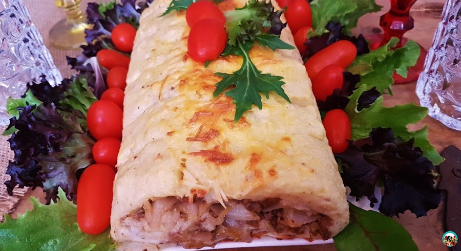 Para hoy tengo un rollo de papas (patatas) relleno de carne picada de ternera y col. Una receta sencilla y sensacional.