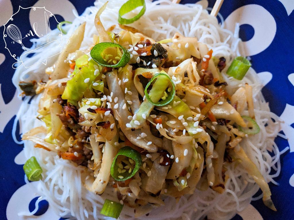 Total, que tenia, como os comentaba, muchas ganas de rollo de primavera… Prepare la salsa agridulce (super sencilla), y el relleno… Y cuando llego el momento de ponerme a hacer las tortillas que se rellenan me pudo la pereza. Me llevan aproximadamente una hora, porque no se pude echar la masa con un cucharon o similar como cuando haces una crepe, sino que tienes que ir pintando con la masa y un pincel de cocina, el fondo de una sarten antiadherente. Y es tedioso… Total, que podia hacer? Pues nada, hidratar unos fideos de arroz, mezclarlos con el relleno de los rollos primavera y mojarlo con salsa agridulce.
