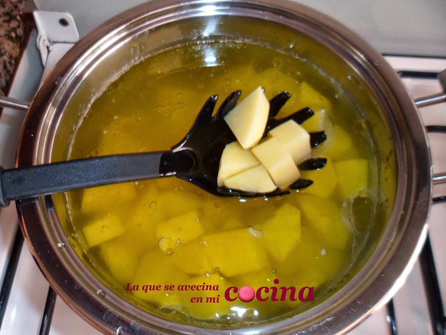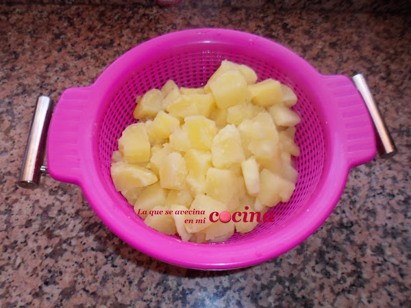 Comenzaremos pelando las patatas y cortándolas en un tamaño similar. De esta forma la cocción será más igualitaria. Ponemos una cacerola con agua fría, sal y un buen chorreoncito de aceite de oliva. Ponemos al fuego y las dejamos unos 10 minutos desde que comience el agua a hervir (si los trozos son medianitos, si son grandes habrá que dejarlo algo más de tiempo).