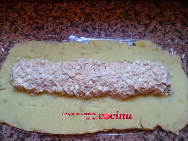 Tomamos el relleno que habíamos reservado y lo pondremos en el centro del puré de patatas. Comprobando "a ojo" que los márgenes que quedan libre de puré cerraran perfectamente cuando digamos de cerrar el rollo.