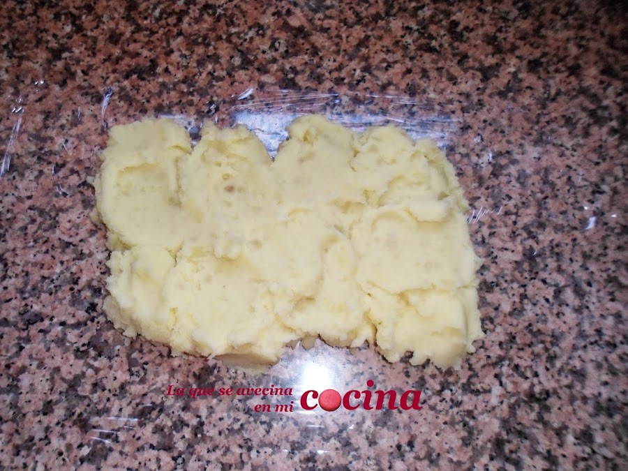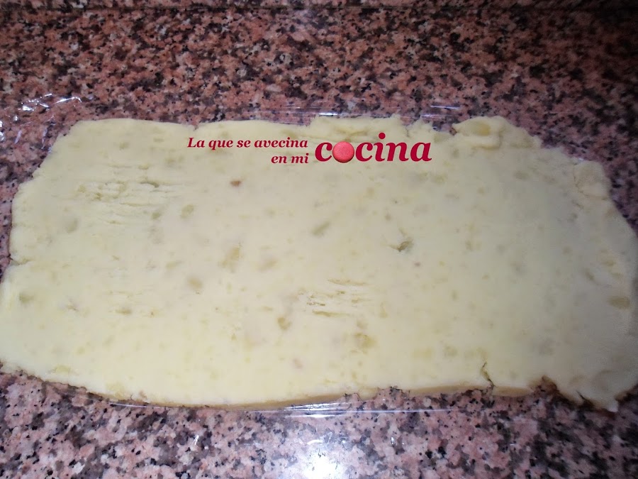 Con nuestro rodillo empezamos a aplastar el puré intentando que quede lo más rectangular y parejo posible. (Como podéis ver en la foto, se notan algunos trozos de patatas, pero es que en mi casa ya os digo que gusta más el puré "basto").
