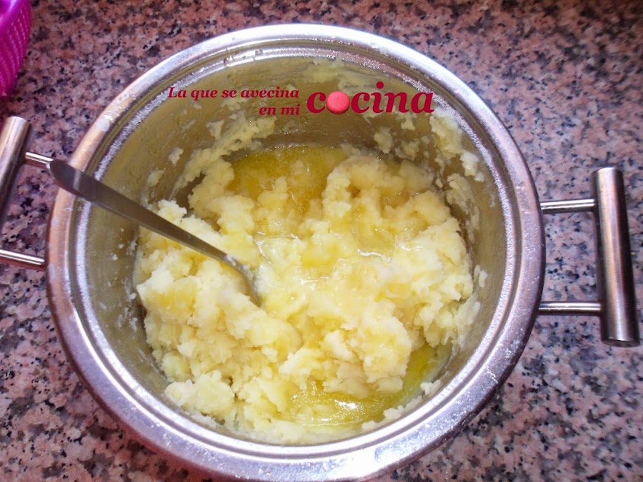Una vez escurridas las patatas, las volvemos a echar en la misma cacerola donde las hemos cocido (así nos ahorramos ensuciar un cacharro más) y comenzamos a machacarlas con el tenedor. Cuando veamos que están machacaditas pero que están muy secas, le añadimos chorrito a chorrito parte de caldo de la cocción.
