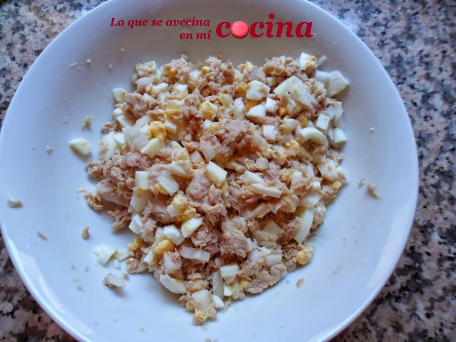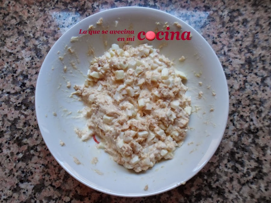 Para ello picamos en trocitos pequeñitos, la cebolla fresca, el huevo duro y escurrimos bien el atún. A continuación lo echamos en un plato, removemos un poco y le añadimos la mayonesa. Yo suelo ponerle unas tres cucharadas bien colmadas, pero esto es al gusto de cada uno según la queramos más seca o no. Removemos todo bien para que se impregnen todos los ingredientes con la mayonesa y reservamos.