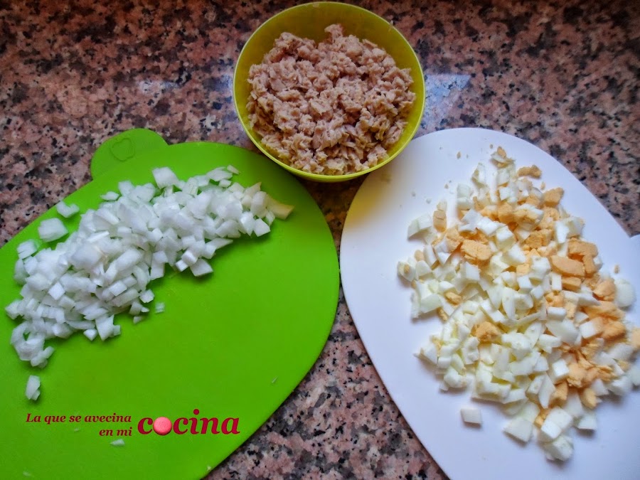 Picamos la cebolla, los huevos y escurrimos el atún.