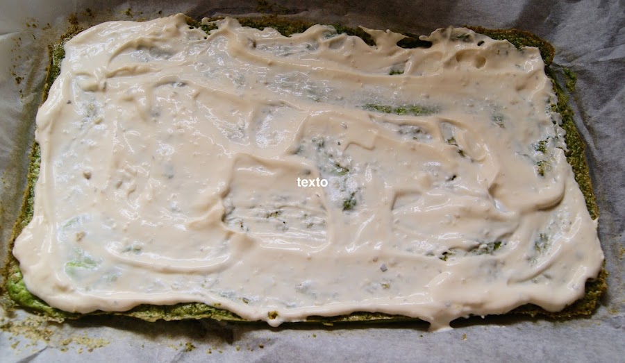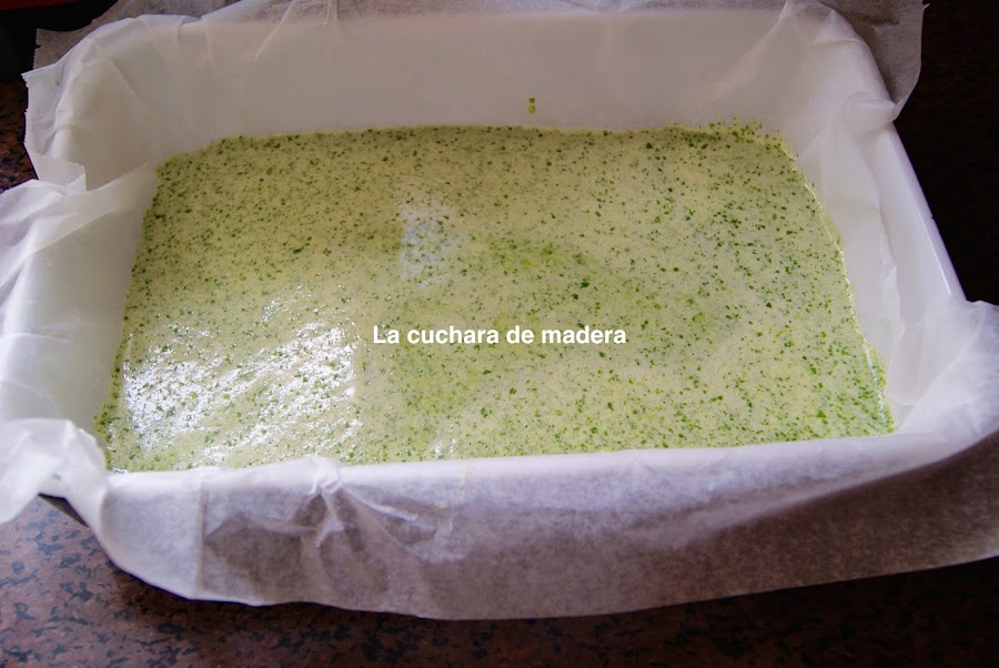En una bandeja de horno ( de 30 * 20 cm ) colocamos papel vegetal bien estirado encima y la mezcla que acabamos de triturar. Lo ponemos al horno unos 35 minutos a fuego de 160 grados