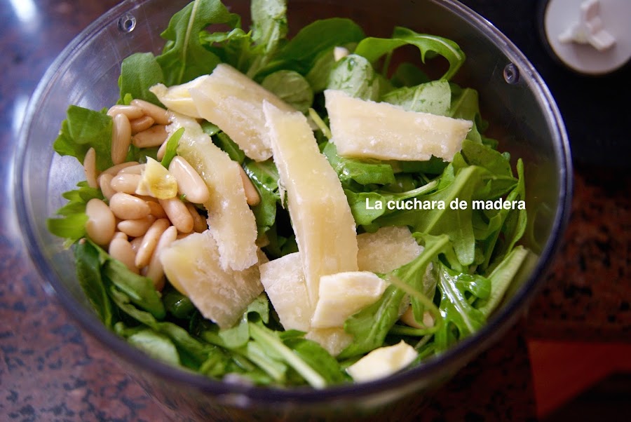 Elaboración:En la trituradora ponemos la rúcula, las espinacas, la albahaca, el queso, los piñones y el diente de ajo.Trituramos bien