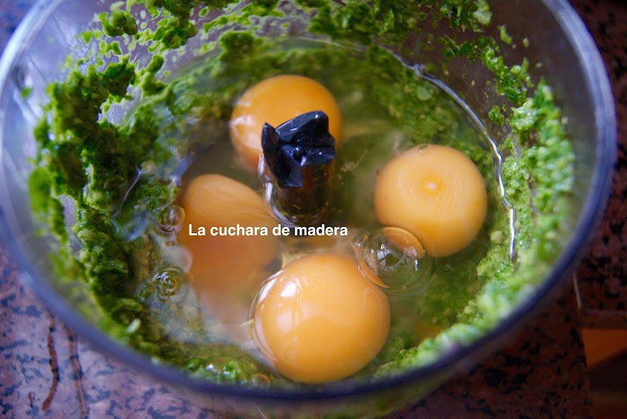 Añadimos los huevos, sal y un hilo de aceite de oliva. Volvemos a triturar